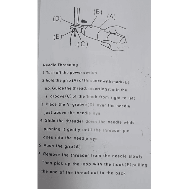 6. Retire lentamente el enhebrador de la aguja y lego levante el hilo con el gancho (E) tirando del extremo del hilo hacia atrás.