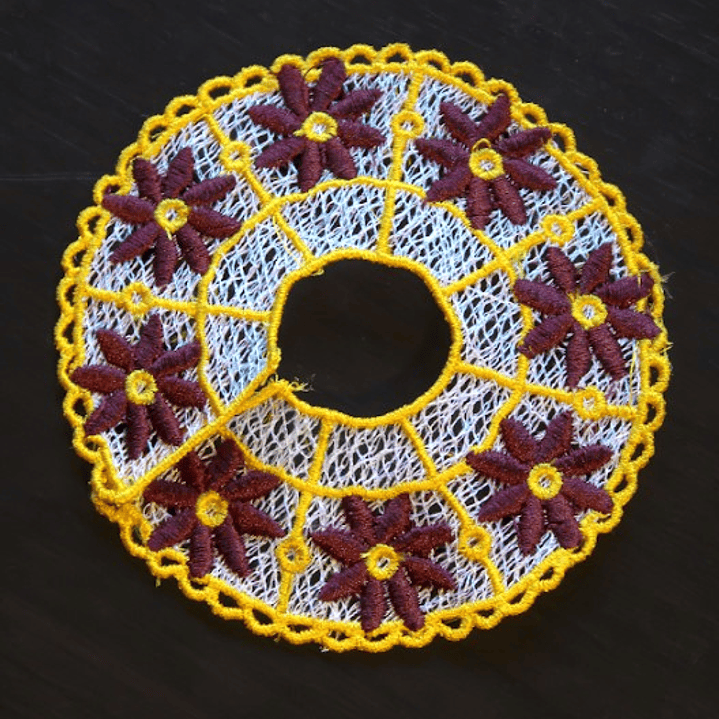 Sólo los diseños digitalizados específicamente para Encajes libres se pueden bordar de esta manera, otros diseños se desarmaran cuando se disuelva el estabilizador.